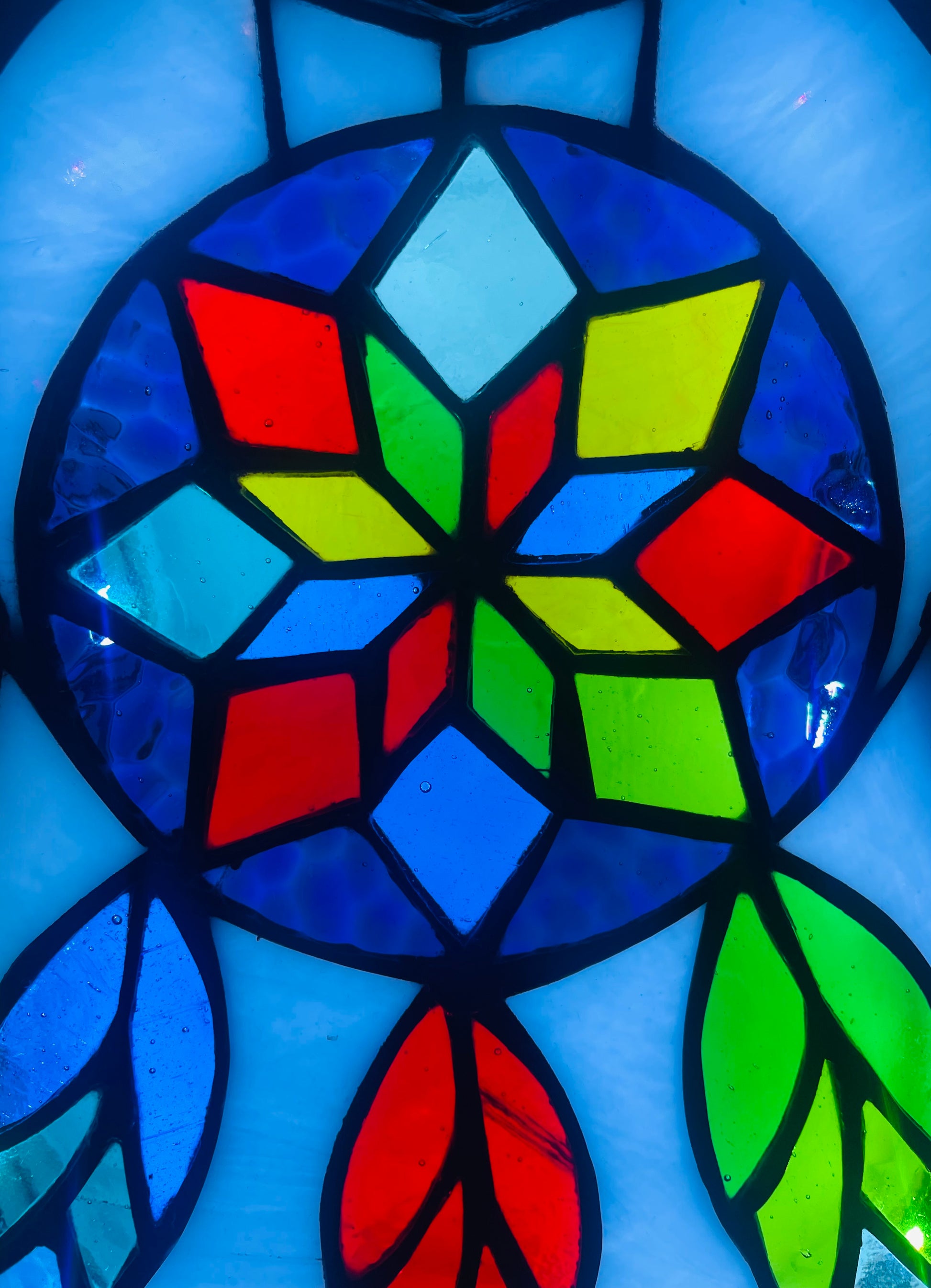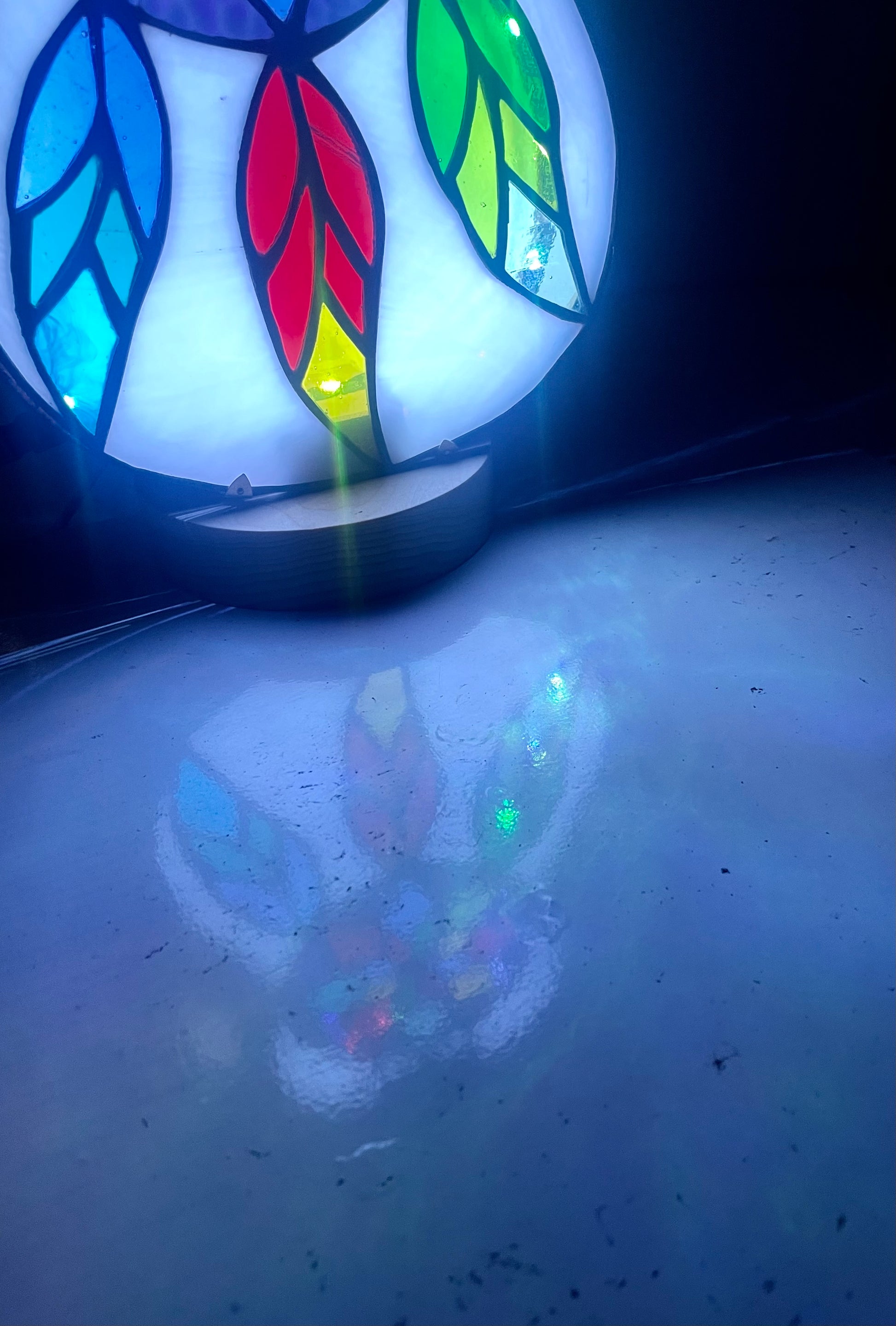 I made this using the copper foil / Tiffany method of stained glass. The front is attached using picture frame clips and can be easily removed to change the lights if needed further down the line.