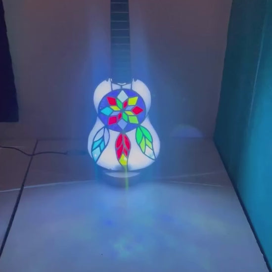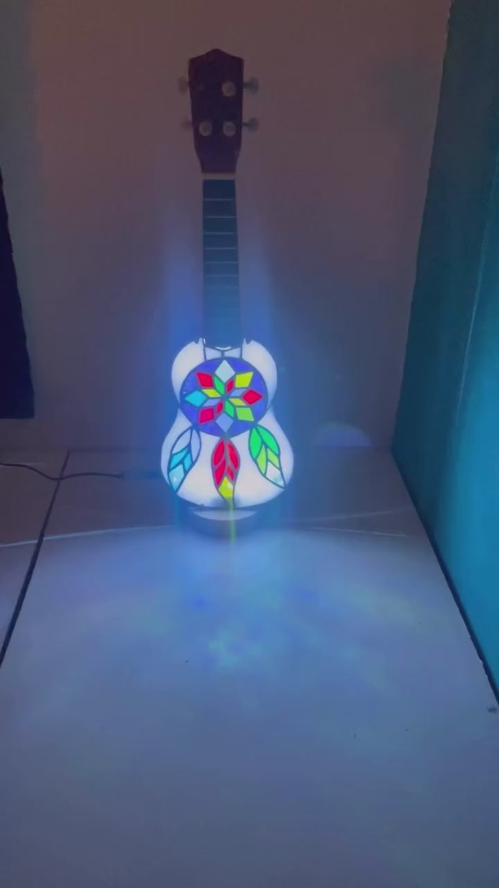 Stained glass Ukulele lamp with a colourful Dreamcatcher design. This is a real ukulele adapted by removing the front and adding LED strip lights to the inside.